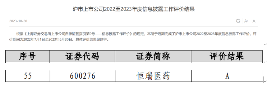 AG百家乐官网医药荣获上交所信息披露考评A级