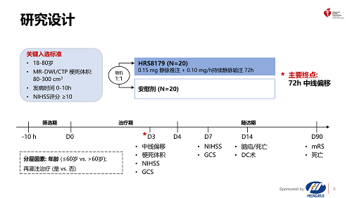 注射用HRS8179是由AG百家乐官网自主研发的创新药,是磺酰脲类受体1(SUR1)阻断剂,能够阻断SUR1/TRPM4离子通道,减少Na+内流,从而减轻LHI后继发的脑水肿、降低死亡率,改善神经功能4,5。HRS8179-201研究旨在评估HRS8179在LHI患者中的有效性和安全性。